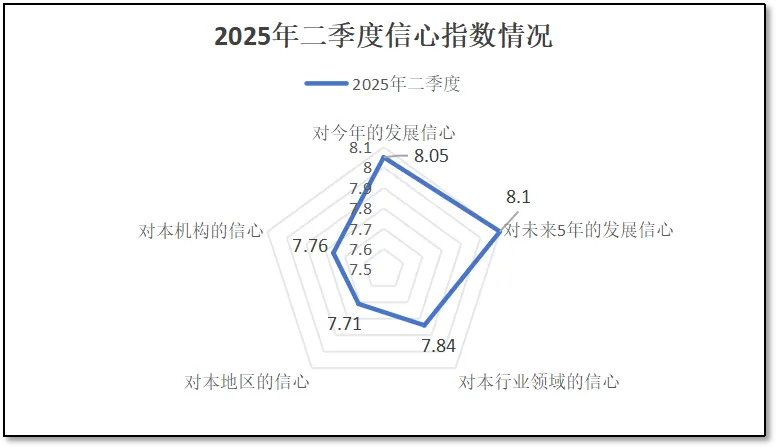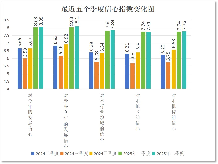 从“未来5年的信心指数”这一中期信心指标来看,在2024年二季度末该指标的得分分值为6.83分,三季度末下降到6.16分,在四季度回升到6.92分后,2025年一季度提高到8.03分,二季度末提升到8.1分,也是五季度以来的最高值。这说明进入2025年以后,尤其是我国一、二季度经济指标持续向好,外贸和消费数据不断增长,再加上印巴战争中中国武器装备的突出表现,国内国际社会对中国经济和综合国力增长的预期进一步升高,在这些因素叠加影响之下,检验检测从业者们对行业的中期发展信心也有了较大增长。