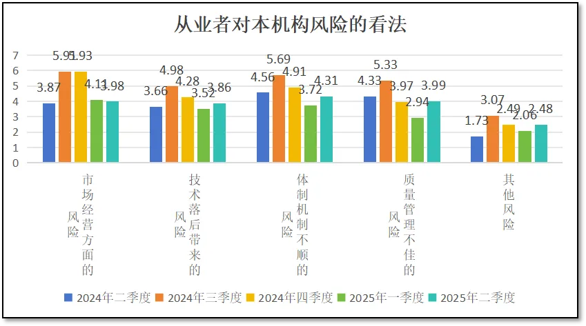 对“技术能力”、“体制机制”、“质量管理”以及“其他”等几个风险事项来说,2025年二季度的分值分别为3.86、4.31、3.99和2.48分,均较上一季度提升不小,说明二季度以来尽管业务逐步恢复,但以前留存的问题依然留存,并逐步显现出对今后发展的影响,业界对这几方面风险的担忧顾虑开始反弹。