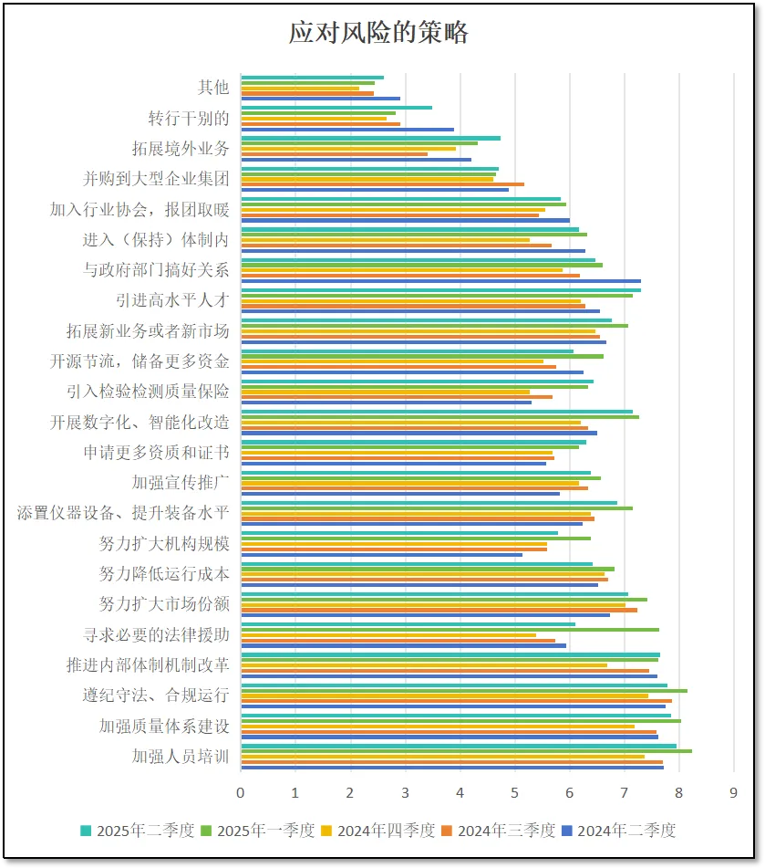 在如何应对检验检测行业发展的风险方面,2025年二季度末,从业者们打出的分值如下面两图所示。