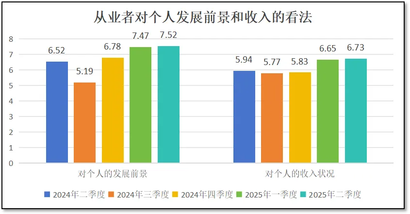 此外,在本次统计调查中,检验检测从业者们对“本人在业内的发展前景信心”这一指标打出的分值为7.52分,也是五季度以来的最高分,但比同期从业者们对检验检测行业整体的发展信心值8.05分要低,这说明从业者们尽管认为行业会向好发展,但由于近年来极度内卷的国内就业市场,对自身发展的乐观情绪还有限。而对于个人的收入状况满意度的这一指标的看法,2025年一季度末得分为6.73分,也是五季度以来的最高分,说明随着对行业发展预期的提升,从业者们认为自身的收入状况也会水涨船高。