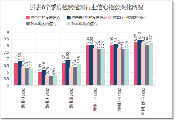 2025年第三季度,中国检验检测行业从业者信心指数在宏观经济“稳中有进、质效提升”的背景下(1-8月工业增加值增长5.2%、消费增长3.4%、外贸增长3.5%)呈现全面回升态势,多项指标创6个季度以来新高。从业者对行业整体发展信心指数达8.27分,较2024年同期提升1.61分;对未来5年中期信心指数攀升至8.42分,连续三季度增长并刷新纪录,同时本行业领域(8.21分)、本地区行业(8.04分)、本机构发展(8.17分)等细分领域信心指标均创历史峰值,显示微观主体预期同步改善。个人层面,从业者对自身发展前景信心达7.96分,收入满意度提升至6.84分,但个人信心仍略低于行业整体水平。行业营商环境评分升至7.53分,市场竞争规范性虽反弹至7.59分,但需警惕年底任务压力下不规范竞争抬头;机构技术能力(8.18分)、数字化智能化水平(7.61分)显著提升,市场开发成效显现,不过质量管理水平(8.03分)仍低于一季度,长期发展后劲待加强。风险应对方面,从业者将“加强人员培训”(8.40分)列为首要措施,其次为“遵纪守法合规运行”(8.11分)和“质量体系建设”(8.10分),反映出对能力建设与合规经营的高度重视。总体来看,行业正逐步走出低谷迈向高质量发展新阶段,但需关注个人与行业信心差距、质量管理投入不足及市场规范性等问题。
