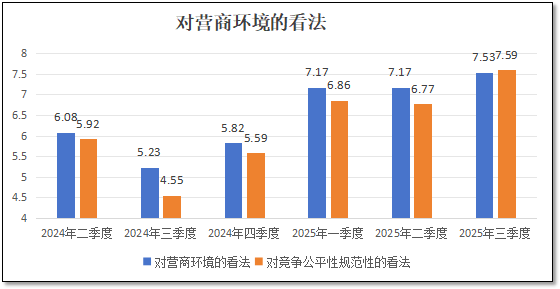 对于“市场经营”方面风险来说,分值从2024年二季度最初的3.87分提高到三季度的5.91分后,去年四季度末进一步提高到5.93分,显示了业内对经营困难的焦虑心理。但2025年一季度以后,该项分值下降到4.11分,重归“低风险”区间,二季度降低到3.98,三季度基本上保持在同样水准上,为3.99分,这一指标的分值已经低于体制机制不顺带来的风险分值,这说明从业者们对于市场经营风险的总体感受比较稳定,认为当前这一因素不是最紧迫的。