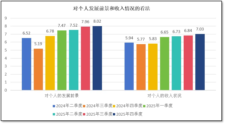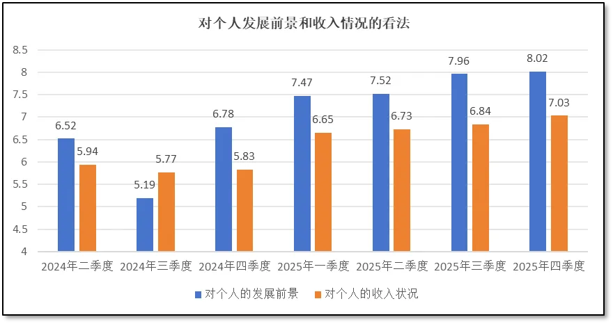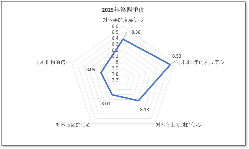 从“对今年的发展信心”指标来看,2025年四季度分值为8.38分,创下7个季度以来的新高,说明从业者受宏观经济形势向好发展的激励,尤其是受到中美贸易战趋缓、近期欧盟多国领导人访华、我国1-11月对外贸易顺差超过1万亿美元等积极因素影响,对行业整体发展的信心进一步提升。此外,也可以推测,临近年末,各机构全年业务指标基本完成,应收账款回款良好,体系运行正常,未出现影响运行的风险事件,有望顺利完成全年工作任务,因此从业者们对今年发展的信心进一步增强。