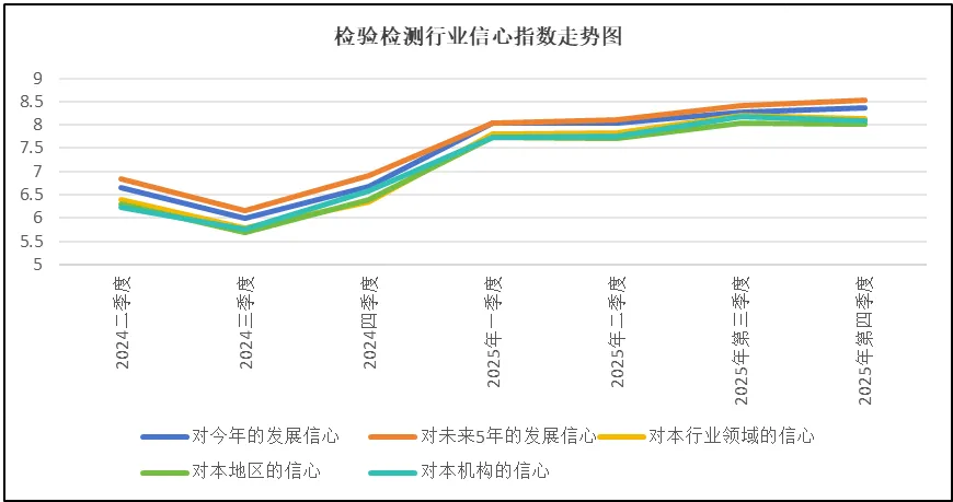 从“未来5年的信心指数”这一中期信心指标来看,四季度也出现了8.53分的历史最高分值。说明得益于十四五期间我国经济的稳健增长,即使经历中美贸易战、房地产持续低迷、外贸下降等不利因素影响,我国经济仍保持了极强的韧性,这使得人们对未来的发展,尤其是十五五期间我国经济的持续向好发展仍充满信心。此外,2025年,市场监管总局公布的检验检测行业统计数据显示,检验检测行业开始出现机构数量减少、劳动生产率提高等高质量发展特征,检验检测行业生态有望持续改善,也使得从业者们对行业发展预期向好,从而提升了对未来五年的发展信心。