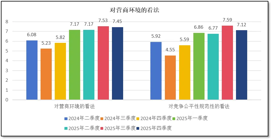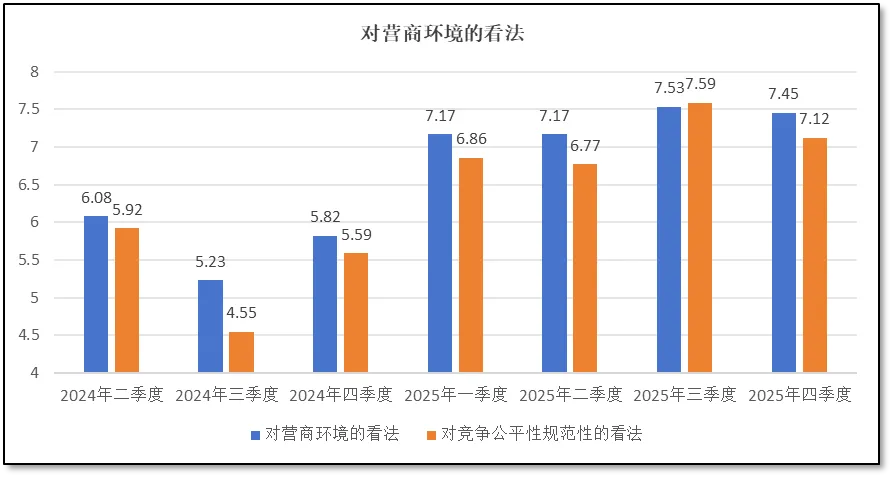 从上面两图可见,2025年四季度,从业者们对营商环境的信心较3季度略有下降,从三季度的7.53分下降到4季度的7.45分。对竞争公平性、规范性的信心上,分值下降更多,从三季度的7.59分下降到四季度的7.12分。这说明,一方面由于临近年底,个别机构为加紧完成全年任务,可能会采取一些低价竞争、投诉举报等不规范的竞争行为,扰乱市场秩序;另一方面,一些行政监管部门也可能会为了完成全年监管或者罚款任务,采取突击检查、密集调研等管理手段,给机构的正常运行带来一定困扰。在这些因素的共同作用下,从业者们对营商环境整体信心出现小幅回落。