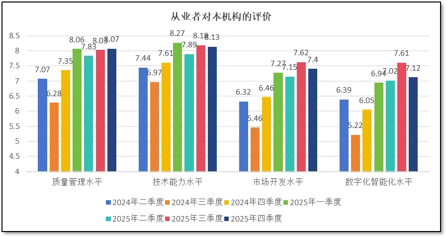 由上两图可见,在四季度末,从业者们对本机构的“质量管理水平”打分为8.07分,对“技术能力水平”打分为8.13分,对“市场开发水平”打分7.4分,对“数字化智能化水平”打分为7.12分。从这些数据来看,除了质量管理水平指标还略有增长外,其余三个指标均比三季度略低,说明从业者们除了认为本机构的质量管理水平仍稳中有升,保持在良好状态之外,对于本机构的技术能力、市场水平以及数字化水平发展情况均存在略不满意的情况。
