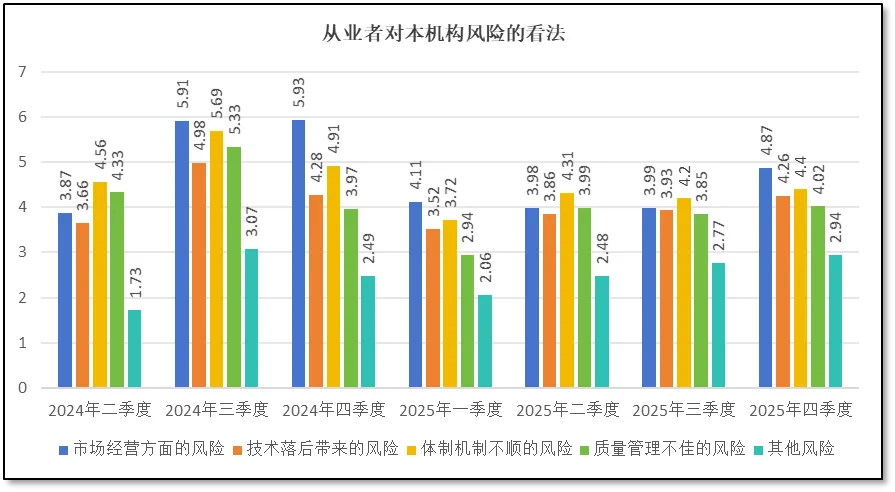 此外,技术落后风险、体制机制不顺的风险、质量管理不佳的风险,以及其他不可预测的风险等四个指标的分值均较前三季度有轻微增长,并均成为2025年以来的最高值。这说明在行业加快转型重组、市场竞争烈度持续升级的背景下,从业者们对各种潜在可能影响本机构发展的“黑天鹅”风险事件越来越担心。不过,尽管焦虑情绪有所抬头,从业者们对本机构四季度面临风险的担忧均未超过2024年的三、四季度,说明2025年总体经营运行情况好于2024年,行业的信心正在恢复和提升之中。