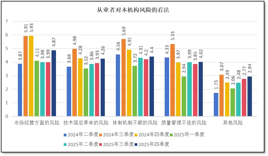 由上面两图可见,四季度以来,从业者们认为本机构所面临的各方面风险均有一定程度增加,其中,认为“市场经营”方面的风险增长最为明显,分值为4.87分,较3季度增长了0.88分,这也是2025年以来的最高值。这与前面从业者们对本机构发展信心有所下降形成呼应,说明尽管行业整体向好,但由于市场环境日趋复杂,对检验检测机构管理层正确决策的要求越来越高,稍有不慎可能就会导致机构运行出现问题,因此从业者们的信心才会动摇和下降,认为市场经营方面的风险有所增大。