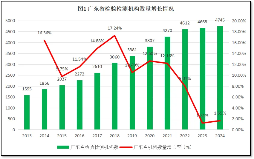 过去12年,广东省检验检测机构数量的平均增速为10.53%,比全国7.24%的年均增速高出3个多百分点,且在多数年份里增长率高于全国平均水平。2024年,广东省检验检测机构数量增长率出现一定的止跌回升现象,有可能意味着我国区域差异化发展的态势进一步加剧,总体行业紧缩但个别区域仍然扩张的现象将会更加明显。
