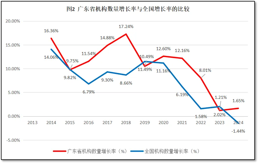 广东省检验检测机构数量增长率与全国检验检测机构数量的增长率进行比较,如图2所示。