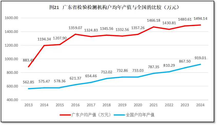 由图23可见,广东省检验检测机构户均出报告数量均高于全国平均水平,说明广东省检验检测机构承接的业务量很大(2021年广东省检验检测机构户均出具报告数量出现一个异常高值,可能存在数据误差)。