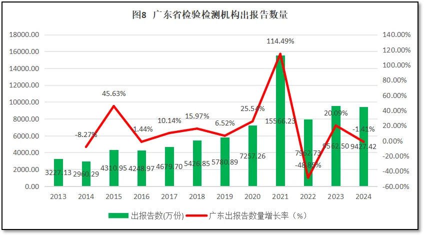 从图8来看,广东省检验检测机构年度对外出具检验检测报告数量总体来说呈现逐年增长的趋势,但在2021年有一个异常增长,当年出具报告数量达到1.56亿份之多,增长率达到114.49%,但次年数据回落到较为合理的区间。2024年度出具报告的数量为9427.42万份,是2013年度数量的2.92倍,较2023年度略有下降。