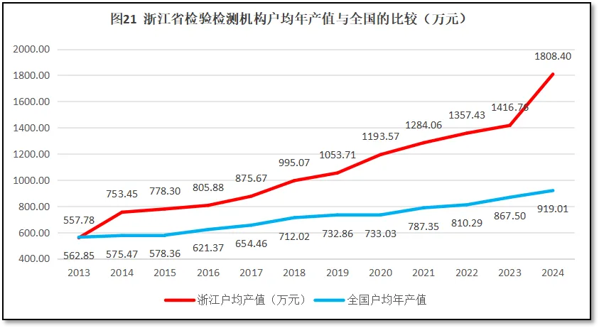 由图20可见,浙江省检验检测机构户均营业收入持续保持增长,2024年户均营业收入是2013年的3.24倍,12年来年均增长11.7%。从增长率的曲线来看,除了头两年数据误差大显得增长率很高之外,在2018年和2020年浙江省户均年产值增长率出现两个小的峰值。2021-2023年,浙江省检验检测机构户均年产值逐步走低,但2024年出现巨大反弹,户均年产值增长率达到27.64%,为2015年以来的最高值。