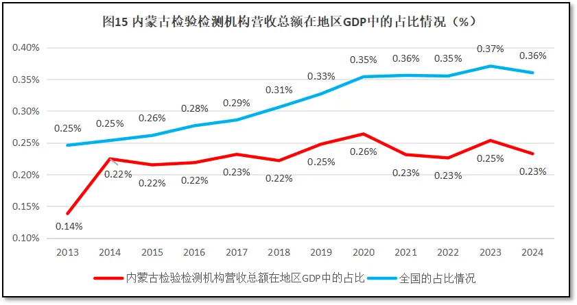 再来看内蒙古自治区检验检测机构营收总额在其地区生产总值GDP中的占比情况。2024年度,内蒙古自治区检验检测机构营收总额61.2亿元,占当年内蒙古自治区GDP值的0.23%,比全国平均值0.36%低了0.13%,排名全国第27位,较2023年度排名下降了4位。过去12年内蒙古自治区检验检测机构营收总额在当地GDP值的比例变化情况如图15所示。