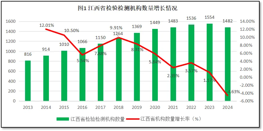 由图1可见,2023年之前,江西省检验检测机构数量总体保持增长,从2013年的816家增长到2023年末的1554家。但2024年江西省检验检测机构数量出现了下降,为1482家,比2023年度净减少了72家,这也是12年来江西省首次出现机构数量下降的情况。从增长率看,江西省检验检测机构数量近十年的增长率逐年下降,降幅越来越大,2024年度已经降到负增长区间,十二年来的年均增长率为5.68%。2024年江西省检验检测机构数量同比增幅为-4.63%,为历年最低,说明江西省也进入了从规模扩张向质量提升转型的阶段。