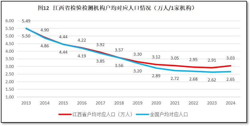 再来看江西省地区检验检测机构户均对应服务的人口情况。2024年末,江西省常住人口4502万人,检验检测机构户均服务人口3.03万人,比全国平均数2.65万人高出3800人,排名全国第8位,较2023年度排名提升了2位。可见,相对于江西省人口数量来说,当地的检验检测机构数量还不算多。过去12年,江西省检验检测机构户均对应的人口数量与全国的情况进行比较,如图12所示。