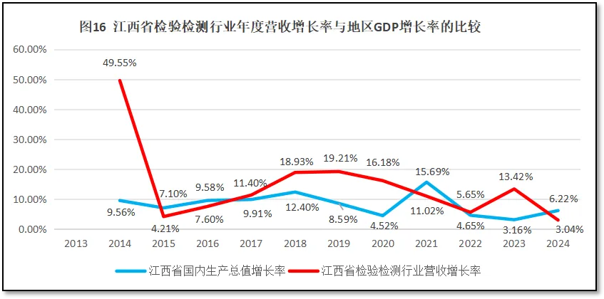 由图16可见,刨除2014年的异常数据之外,从2015年起,江西省检验检测机构年度营收总额的增长率出现了一先增后降的发展特点,增长率从2015年的4.21%增长到2019年的19.21%,之后逐年下跌,到2022年增长率回落至5.65%。2023年增长率有所反弹,达到13.42%,2024年再度回跌,降到3.04%。2015年以来,江西省检验检测机构年度营收总额的年均增幅为11.06%,比同期其区域GDP的年均增速8.18%高一些。这说明,江西省检验检测行业近十年的增长速度略快于当地经济增长速度,但由于检验检测机构营收不高,基础薄弱,对区域经济的贡献仍然偏低。