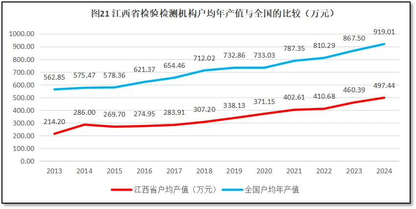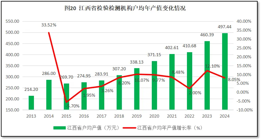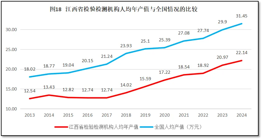 由图18可见,在2017年之前,江西省检验检测机构人均年产值一直在12.5万元左右波动,没有出现明显增长。而同期全国平均数增长很快。2017年以后江西省检验检测机构人均年产值开始增长,但与全国平均数仍保持着较大距离,2024年落后于全国平均数9万元左右。这表明,由于种种原因,江西省检验检测行业发展迟缓,劳动生产率低,在各省竞争中明显落后。
