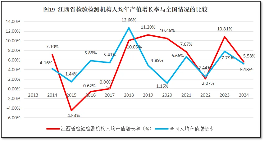 再来看江西省检验检测机构人均年产值增长率与全国人均年产值增长率的比较,如图19所示。