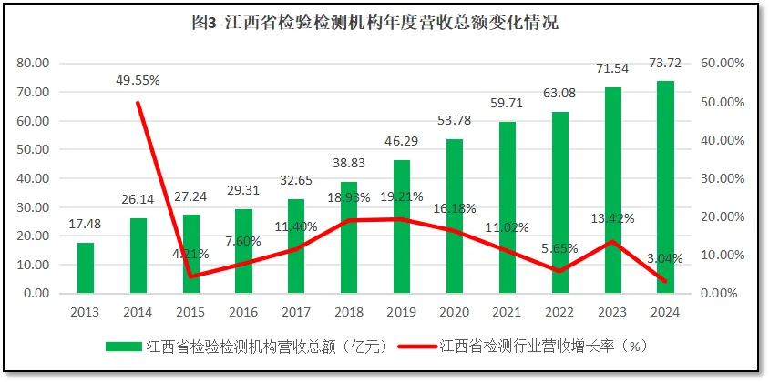 过去十二年,行业经历“规模扩张-增速放缓-拐点转型”的发展周期:机构数量从2013年的816家增长至2023年峰值后,2024年首次下降72家,年均增长率5.68%低于全国平均水平;营收总额增长4.21倍,但2024年增速降至3.04%,为历年最低;就业人数和报告数量在2023年后首次出现负增长,标志行业从规模扩张向质量提升转型。值得关注的是,江西省检验检测行业对市场波动具有“先行性”,机构数量、营收增速等指标调整往往早于全国1-2年,显示行业对市场变化敏感度较高。
