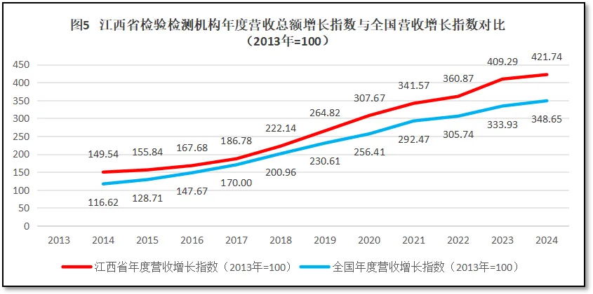 再来看营收总额增长指数的情况,若以2013年检验检测服务业统计制度实施元年的检验检测行业营收总额作为基准100计,江西省检验检测行业营收总额增长指数与全国平均情况的比较如图5所示: