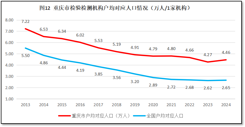 再来看重庆市地区检验检测机构户均对应服务的人口情况。2024年末,重庆市常住人口3190万人,检验检测机构户均服务人口4.46万人,比全国平均数2.65万人高出1.81万人,排名全国第1位。可见,相对于重庆市较为庞大的人口数量来说,当地的检验检测机构数量显得太少了。过去12年,重庆市检验检测机构户均对应的人口数量与全国的情况进行比较,如图12所示。