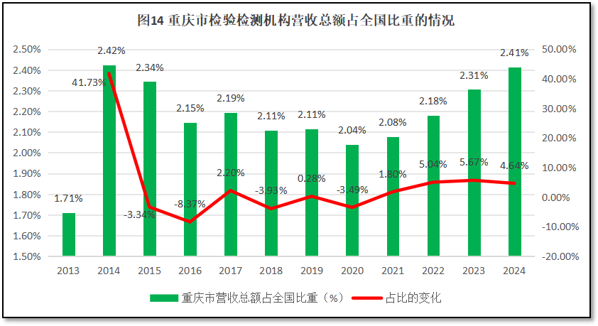由图14可见,重庆市检验检测机构营收总额在全国检验检测行业营收总额中的比重从2013年的1.71%增长到2014年的2.42%之后开始下降,到2020年降到2.04%后又有所回升,2024年末的占比为2.41%,几乎等同于2014年当时的占比。从增长率曲线来看,刨除第一年的异常数据,重庆市检验检测机构营收总额占比增长不多,11年来的年均增幅为0.05%,说明重庆市检验检测机构在全国的地位和贡献比较稳定,稳中有升。