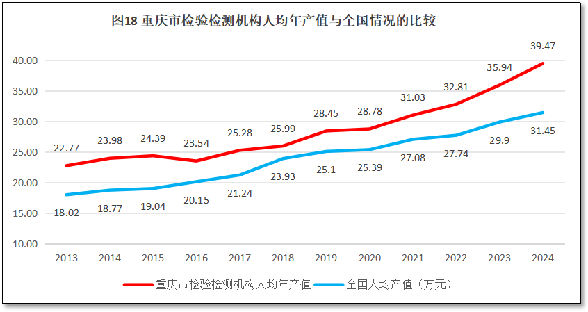 重庆市检验检测机构人均年产值与全国的情况比较如图18所示。