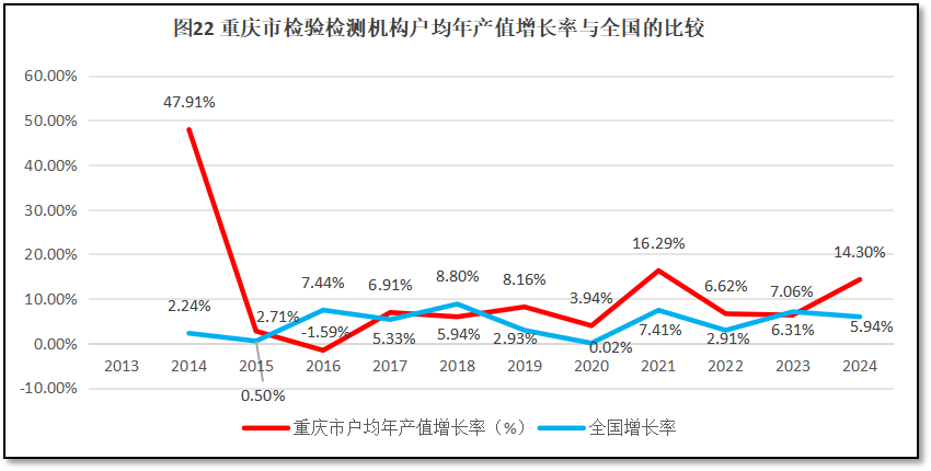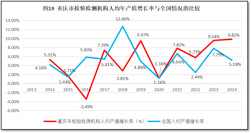 再来看重庆市检验检测机构人均年产值增长率与全国人均年产值增长率的比较,如图19所示。
