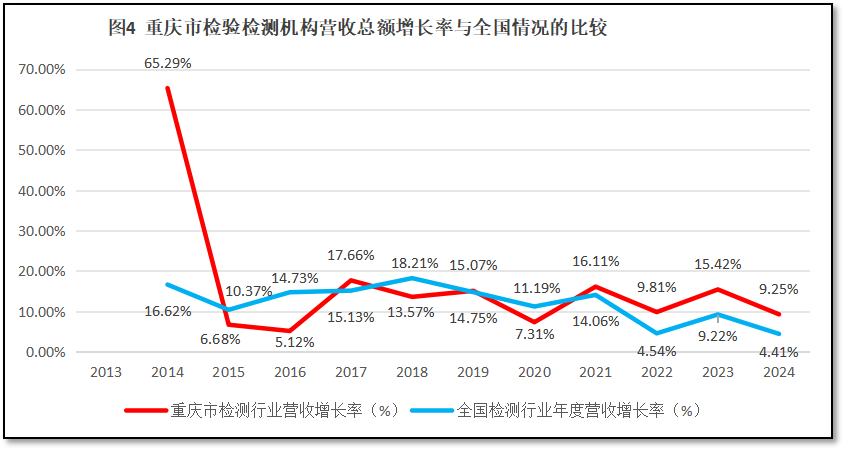 比较重庆市检验检测行业年度营收总额增长率与全国检验检测行业年度营收总额增长率随时间的变化,如图4所示。