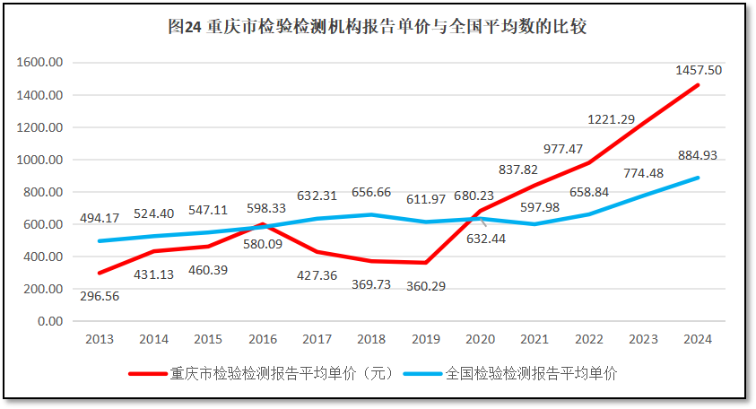由图24可见,重庆市检验检测报告的单价呈现“先平稳后增长”的发展趋势,在2013-2019年期间总体平稳,虽然一度增长到近600元的峰值,但很快回落,多数年份保持在300-400元范围内波动。从2019年起重庆检验检测报告单价开始快速增长,到2024年末已经达到1457.50元,是2013年的4.91倍,排名全国第3位,较2023年度排名提升1位。总体来说,重庆市检验检测机构在报告数量没有明显减小的情况下,检验检测报告单价近年来逐步增长,有利于检验检测机构提升经济效益。