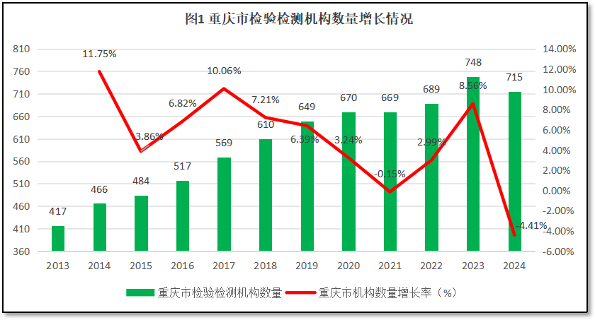 由图1可见,2023年之前,重庆市检验检测机构数量总体保持增长,从2013年的417家增长到2023年的748家,增长了1.79倍。但2024年重庆市检验检测机构数量出现明显下降,回落到715家,比2023年净减少33家。从增长率看,重庆市检验检测机构数量增长率呈现出W型的变动趋势,在2014年、2017年和2023年出现较高增幅,但在2015年和2021年也出现了较明显的下降,尤其是2024年,同比增幅降到了-4.41%,是历年下降幅度最大的一次。