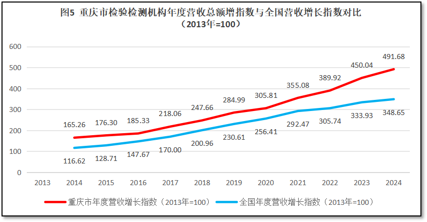 由上图可见,重庆市检验检测机构营收总额增长指数一直保持着高于全国平均数的水平发展,到2024年增长指数的差距高出140左右,在基数较高的情况下仍保持如此高的增长指数,说明重庆市检验检测行业发展质量好,动能足。