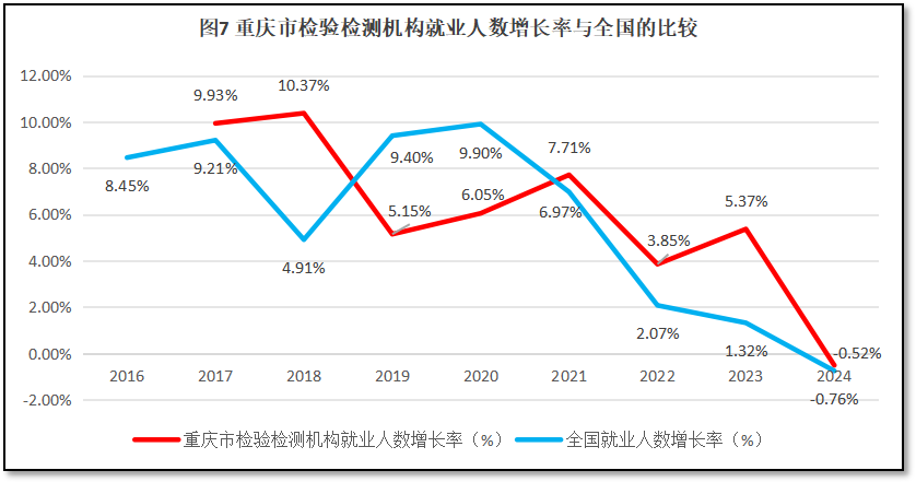 重庆市检验检测机构就业人数增长率与全国检验检测机构就业人数增长率的比较如图7所示。
