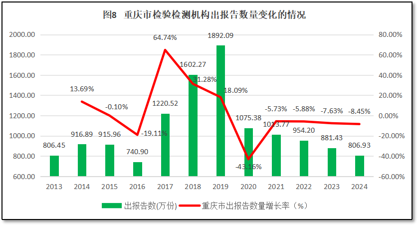 从图8来看,十二年来,重庆市检验检测机构对外出具报告数量总的趋势是先增后降,从2013年的806.45万份增长到2019年的1892.09万份,此后又逐步下降,到2024年检验检测报告数量降至806.93万份,与2013年的数量相差不大。从增长率曲线来看,重庆市在2017年出现了一次检验检测报告数量的剧烈增长,2020年又出现检验检测报告数量的大幅下滑,最近几年持续下降。