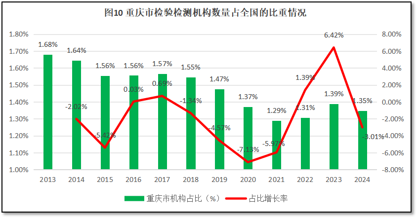 由图10可见,重庆市检验检测机构数量在全国检验检测机构总数中的占比呈现缓慢波动下降的变化,从2013年的1.68%逐步下降到2021年的1.29%,此后又回升到2023年的占比1.39%,2024年再度下降到1.35%。重庆市作为年轻的直辖市,经济增长很快,但原有的检验检测体系规模不大,在全行业中的占比不高。