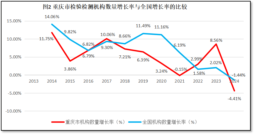 重庆市检验检测机构数量增长率与全国检验检测机构数量的增长率进行比较,结果如图2所示。