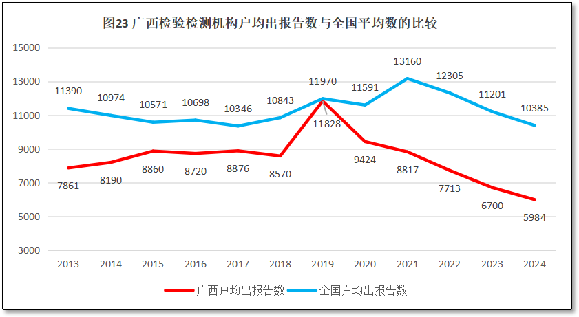 2024年度,广西壮族自治区检验检测机构户均出具检验检测报告5984份,是全国平均水平10385份的57.6%,全国排名第21位,较2023年度排名提升1位。从2013年以来,广西壮族自治区检验检测机构户均出具检验检测报告数量与全国情况的比较如图23所示。