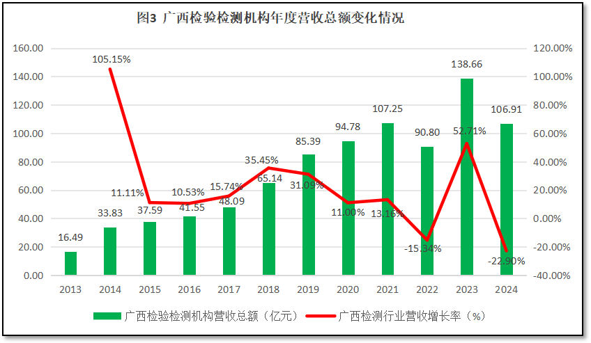 由图3可见,2021年之前,广西壮族自治区检验检测机构营收总额持续保持增长,但2022年出现了较大降幅,2023年又重新涨了回来,并创下新高,然后2024年又再次下跌。2024年末广西壮族自治区检验检测行业年度营收总额为106.91亿元,是2013年的6.48倍,但比2023年度的峰值减少了31.75亿元。从增长率曲线来看,除了头两年因统计数据质量不高导致曲线波动巨大之外,2015至2021年,广西壮族自治区检验检测机构营收总额增长率保持在10%以上的高增速中,在2018年出现了35.45%的增长高峰。2022年,广西壮族自治区检验检测机构营收总额出现-15.34%的负增长,但2023年出现了大幅反弹,当年增长率达到52.71%,创下历年增幅新高。但是,2024年,又出现了-22.90%的降幅。可见,最近两年广西检验检测行业发展极不稳定,营收状况起伏很大。