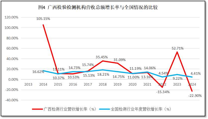 比较广西壮族自治区检验检测行业年度营收总额增长率与全国检验检测行业年度营收总额增长率随时间的变化,如图4所示。