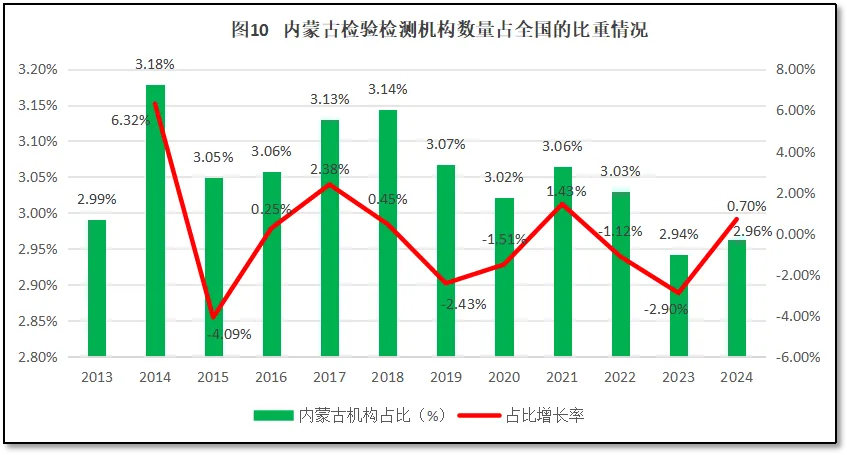 截至2024年末,内蒙古自治区检验检测机构数量为1572家,约占全国检验检测机构数量的2.96%,排名全国第16位,与2023年度排名持平。过去12年,内蒙古自治区检验检测机构数量在全国检验检测行业中的占比以及占比的增长率如图10所示。