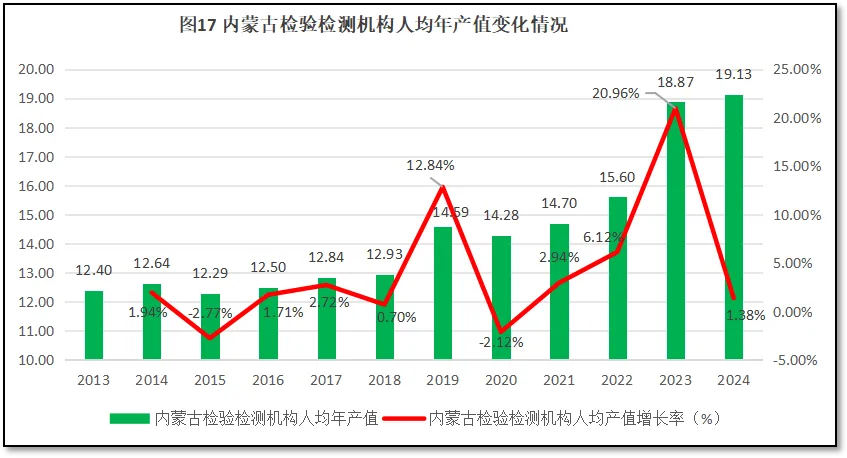 由图17可见,2024年度,内蒙古自治区检验检测机构人均年产值为19.13万元,离30万元行业温饱线和2024年度全国31.45万元的人均产值还有不小距离,排名居于全国第27位(由高往低排序),较2023年度排名下降了2位,不仅排名在全国处于落后地位,排名的下降更说明内蒙古检验检测行业的发展速度低于其他地区。12年来,内蒙古自治区检验检测机构人均年产值增长很缓慢,从2013年到2018年一直在12万元左右徘徊。在2019年才有了一个较大幅度的提升,达到14.59万元。此后又停留在14.5万元左右波动,直到2023年才出现了又一个较大的增长,人均年产值达到18.87万元。2024年较2023年增长不多,仅增长了两千余元。从增长率曲线来看,内蒙古自治区人均年产值同比增幅曲线在2019和2023年有两个稍大的增幅,其余年份增幅不大,年均增幅仅有4.22%,低于同期全国5.23%的年均增幅。