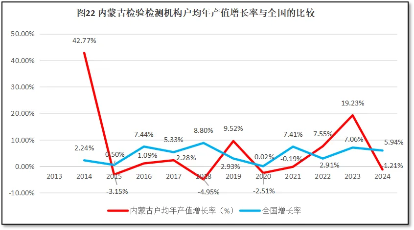 再来看内蒙古自治区检验检测机构人均年产值增长率与全国人均年产值增长率的比较,如图19所示。