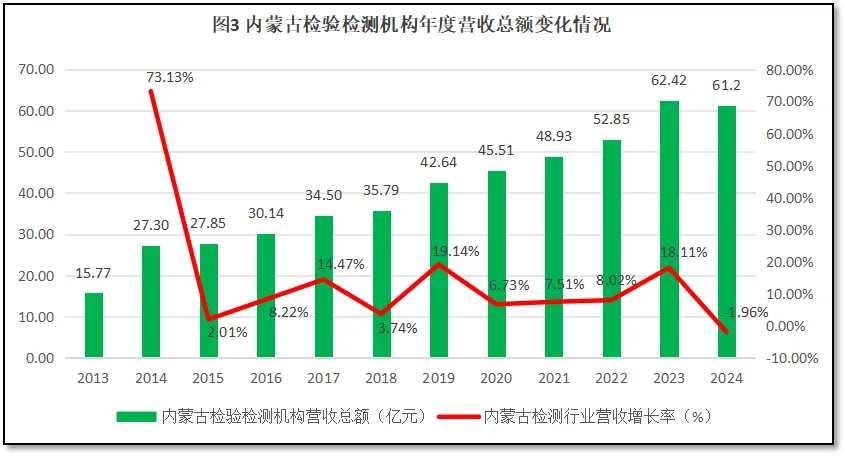 由图3可见,2023年之前,内蒙古自治区检验检测机构营收总额总体保持增长。但2024年度出现了轻微下降,2024年末内蒙古自治区检验检测行业年度营收总额为61.2亿元,是2013年的3.88倍,但较2023年度的最高值下降了约1.2亿元。从增长率曲线来看,除了头两年因统计数据质量不高导致曲线波动巨大之外,其余年份总体增长平稳,在2019年和2023年先后出现两次超过18%的增长高峰,但2024年首次出现负增长,拉低了过去10年内蒙古自治区检验检测机构营收总额的年均增长率。过去10年,内蒙古自治区检验检测机构营收总额的年均增速为8.59%,较2023年度统计结果(2015年-2023年平均增速)下降了约1个百分点。2023年,内蒙古自治区检验检测机构数量已经出现减少的情况,但营收总额仍保持了增长,但2024年检验检测机构数量继续减少,营收总额也出现了下降,说明内蒙古自治区检验检测行业的转型过程并非一帆风顺,目前面临的发展困难也已经凸显。