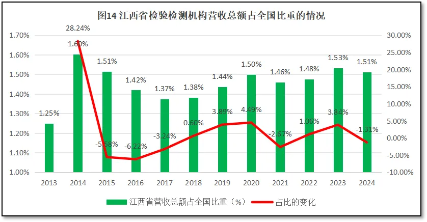 由图14可见,江西省检验检测机构营收总额在全国检验检测行业营收总额中的比重从2013年的1.25%增长到2014年的1.60%之后就开始下降,到2017年占比降到1.37%,此后又微微上升,到2024年占比为1.51%。从增长率曲线来看,刨除2014年异常数据,从2015-2024年江西省检验检测机构营收总额占比的增长率多数年份为负数,虽然个别年份有一些反弹,但10年来的年均增幅为-0.51%,微微下降,说明江西省检验检测机构在全国的地位和贡献稳中有降。