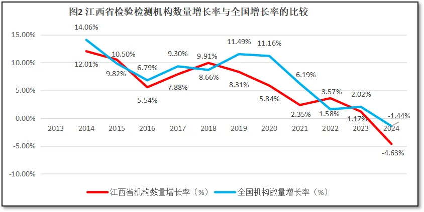 江西省检验检测机构数量增长率与全国检验检测机构数量的增长率进行比较,结果如图2所示。
