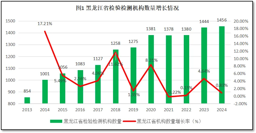 由图1可见,十二年来,黑龙江省检验检测机构数量总体保持增长,从2013年的854家增长到2024年末的1456家。从增长率看,刨除第一年的异常数据,黑龙江省检验检测机构数量在2018年、2020年出现两个较高增幅,其余年份增速不高,近十年的增长率总体走势是逐步下降,十二年来的年均增长率为5.09%。2023年黑龙江省检验检测机构数量同比增幅4.64%,相较2021和2022年出现一定反弹,但2024年增幅下降,仅有0.83%。在全国整体检验检测机构数量已经出现下降的背景下,黑龙江省的机构数量仍在增长,说明目前黑龙江省检验检测行业的发展阶段还没有从规模扩张向质量提升转换。