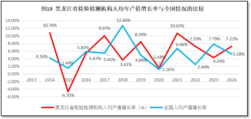 再来看黑龙江省检验检测机构人均年产值增长率与全国人均年产值增长率的比较,如图19所示。