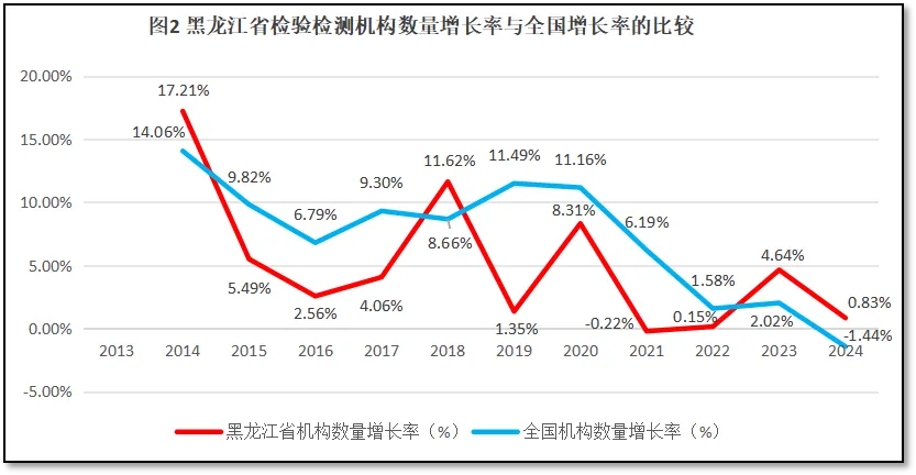 黑龙江省检验检测机构数量增长率与全国检验检测机构数量的增长率进行比较,结果如图2所示。