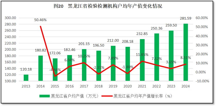 由图19可见,黑龙江省检验检测机构人均年产值的变动规律与全国曲线差异较大,各年起伏程度和趋势并不相同,但涨跌幅大小类似,因此平均下来黑龙江省检验检测机构人均年产值的年均增幅(5.84%)与全国的平均数(5.23%)相差不大。不过,由于黑龙江省过低的基数,因此虽然增速相似,但到2024年所展现出来的实际人均年产值数值差距却越来越大。